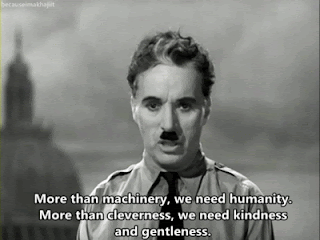 We think too much and feel too little. More than machinery ,we need humanity. More than cleverness, we need kindness and gentleness. Without these qualities, life will be violent and all will be lost. The aeroplane and the radio have brought us closer together. The very nature of these inventions cries out for the goodness in man; cries out for universal brotherhood; for the unity of us all.